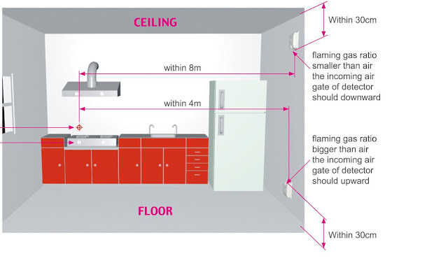 Untuk LPG, maka letak detector adalah di bawah, yaitu sekitar 30 cm dari lantai dengan arah detector menghadap ke atas. Hal ini dimaksudkan agar saat bocor, gas elpiji yang turun akan masuk ke dalam ruang detector sehingga dapat terdeteksi. Jarak antara detector dengan sumber kebocoran tidak melebihi dari 4m.